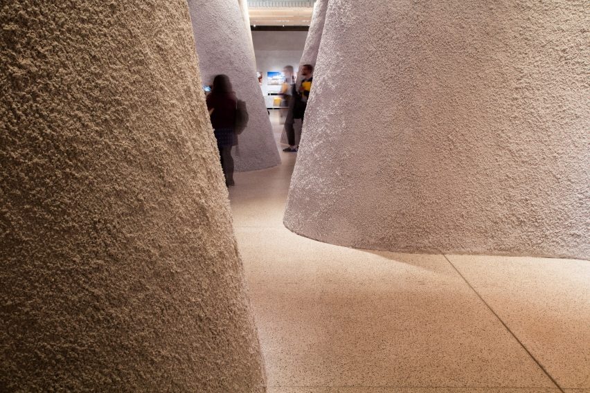 倫敦公司Carmody Groarke為每個(gè)部分創(chuàng)造了類似石窟的空間,與去年展覽的簡(jiǎn)單底座和單元形成鮮明對(duì)比,整體結(jié)構(gòu)由木框架形成,該框架已經(jīng)噴涂有名為Soundcel的再生紙漿材料,通常用于建筑以提供隔熱。