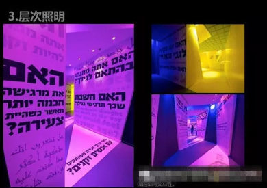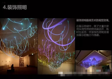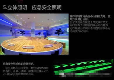 立體照明常用于熒光燈的亮度、霓虹燈的點綴。為了讓觀眾在視覺上感受到展廳的寬敞,同時也為了讓展品更具吸引力,燈具可以在展示空間的不同方向、不同高度擺放。