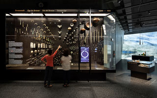 “地理”展覽中,展示了關(guān)于展示文物的具體地理位置參考。一個由3000多個零件組成的鋁質(zhì)金屬地質(zhì)模型懸掛在展廳的頂部,高低不一,讓游客仿佛漫步徘徊于瑞士美好秀麗的風(fēng)光之中。通過燈光的照射效果,這個金屬地質(zhì)模型,形成了光與影的舞蹈,讓游客在這時光遂道里盡情感受著來自遠古的生活和詩意。